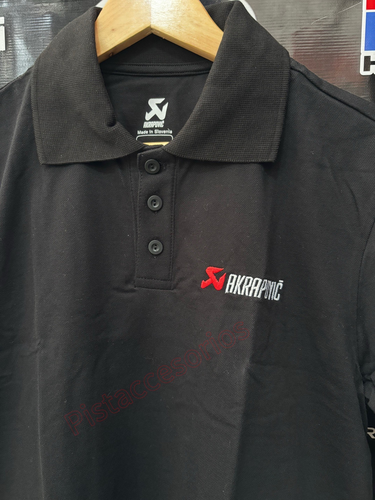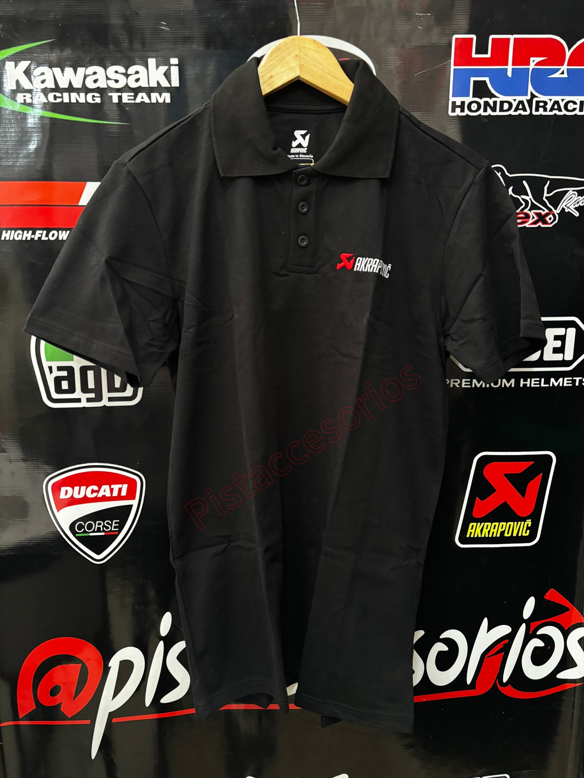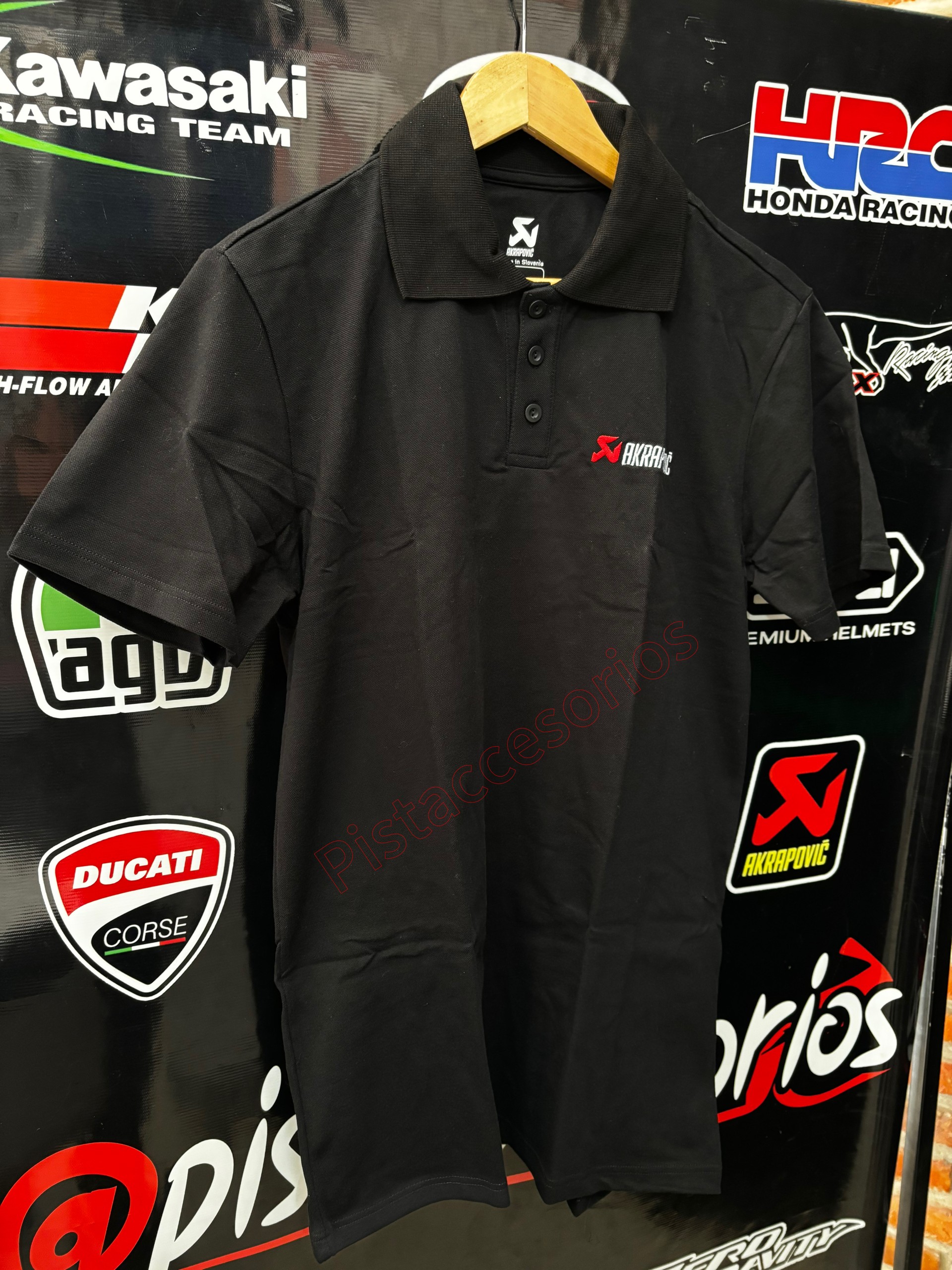 Polo con logo de Akrapovic sutilmente bordado en la parte delantera y trasera.